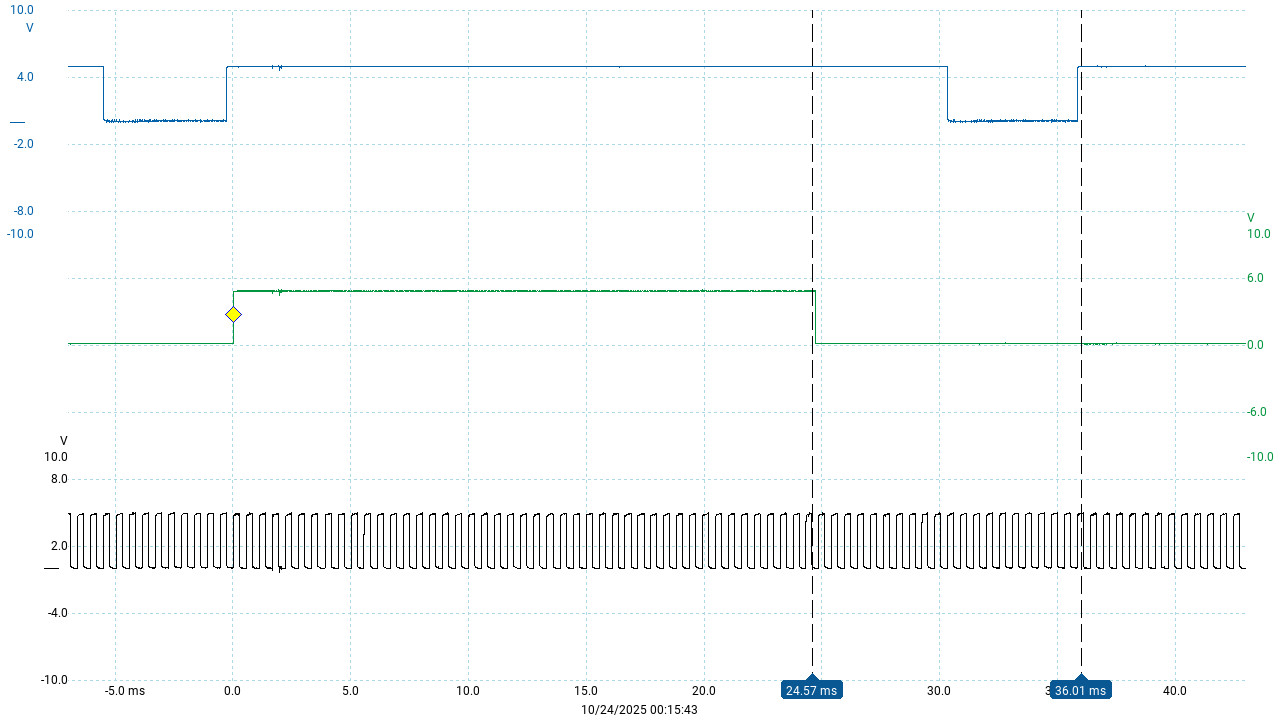 Here, the green trace is the digitized ref sensor and the black trace is the digitized speed sensor.