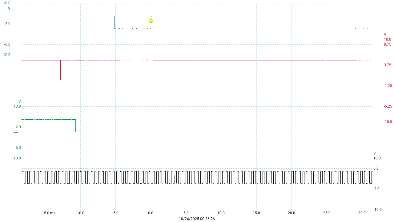 From here on, we can mostly ignore the raw analog signals and explore everything using the digitized versions. For example here’s a scope trace of the ignition signal (in blue) along with the ref and speed sensor pulses - when the blue pulse goes low, the coil is turned on and the dwell period begins. When it goes high, coil current is stopped and the spark fires.